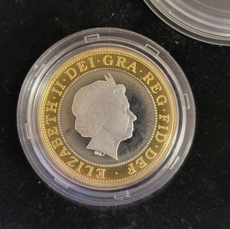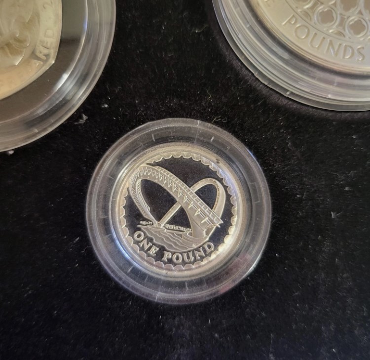 Reverse designs include Diamond Wedding Crown, Act of Union £2 and Millenium Bridge £1